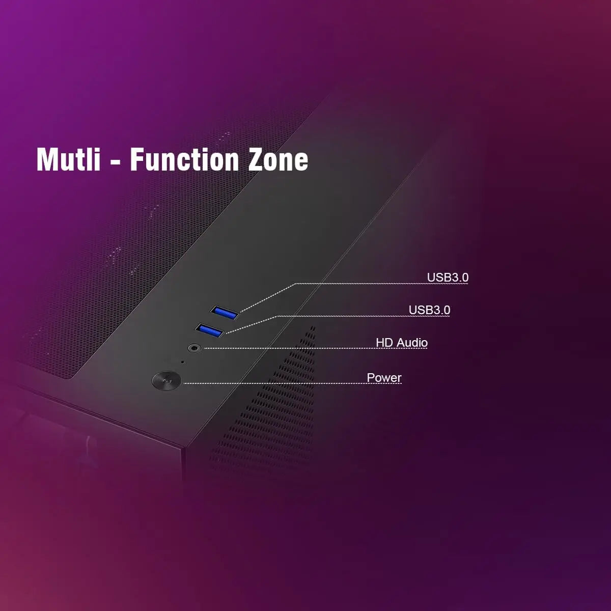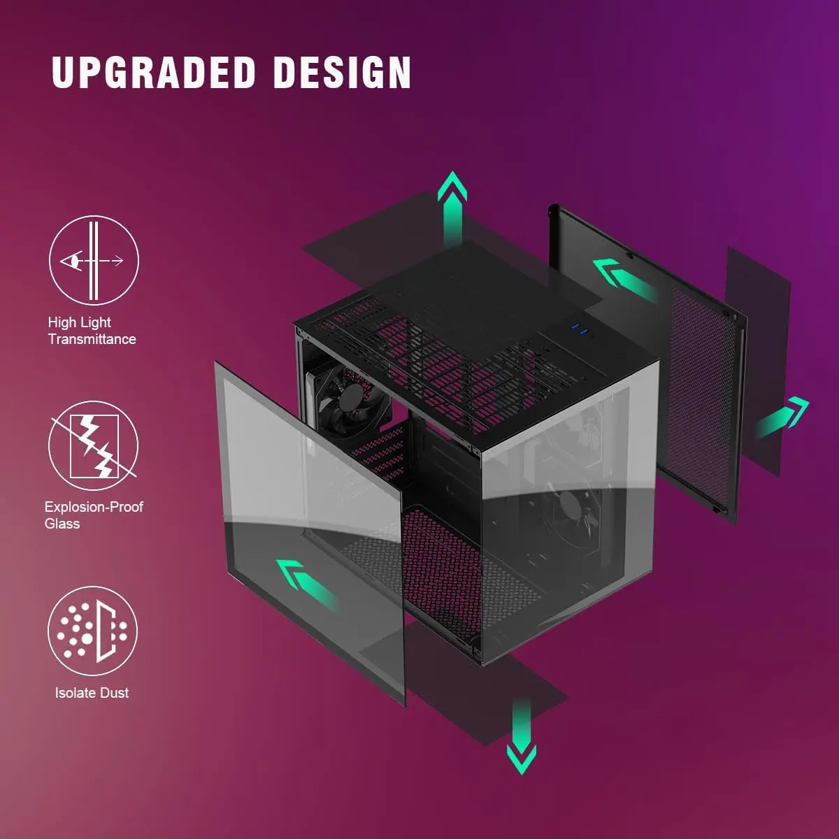 【Smart & Compact Design】This mini-tower case measures 13.39 x 10.87 x 12.4 inches, offering a space-saving solution without compromising on functionality. Perfect for compact desktop setups, it maximizes efficiency in limited spaces. 【Excellent Compatibility】Despite its small size, this case supports a wide range of components: GPUs up to 330mm in length, CPU coolers up to 160mm in height, MATX or ITX motherboards, and both 3.5-inch and 2.5-inch drives. It ensures flexibility for various builds. 【Pre-Installed High-Performance Fans】Three 120mm ARGB PWM prism gaming fans are pre-installed, providing vibrant lighting effects and efficient cooling right out of the box. This saves time and effort during setup. 【Panoramic Tempered Glass Panels】Featuring two sides of tempered glass with protective film, the case offers high transparency and durability while being shatter-resistant. Enjoy a clear view of your components for an enhanced aesthetic appeal. 【Superior Ventilation & Dust Protection】The case supports up to seven fans or five fans with a 240mm AIO liquid cooler for optimal airflow. Large magnetic dust filters on the top and bottom prevent dust buildup, keeping your system clean and maintaining peak performance over time. 【Additional Features】Includes USB 3.0 ports for fast connectivity and easy access. The compact design is ideal for gamers and enthusiasts looking to build a powerful yet space-efficient system.