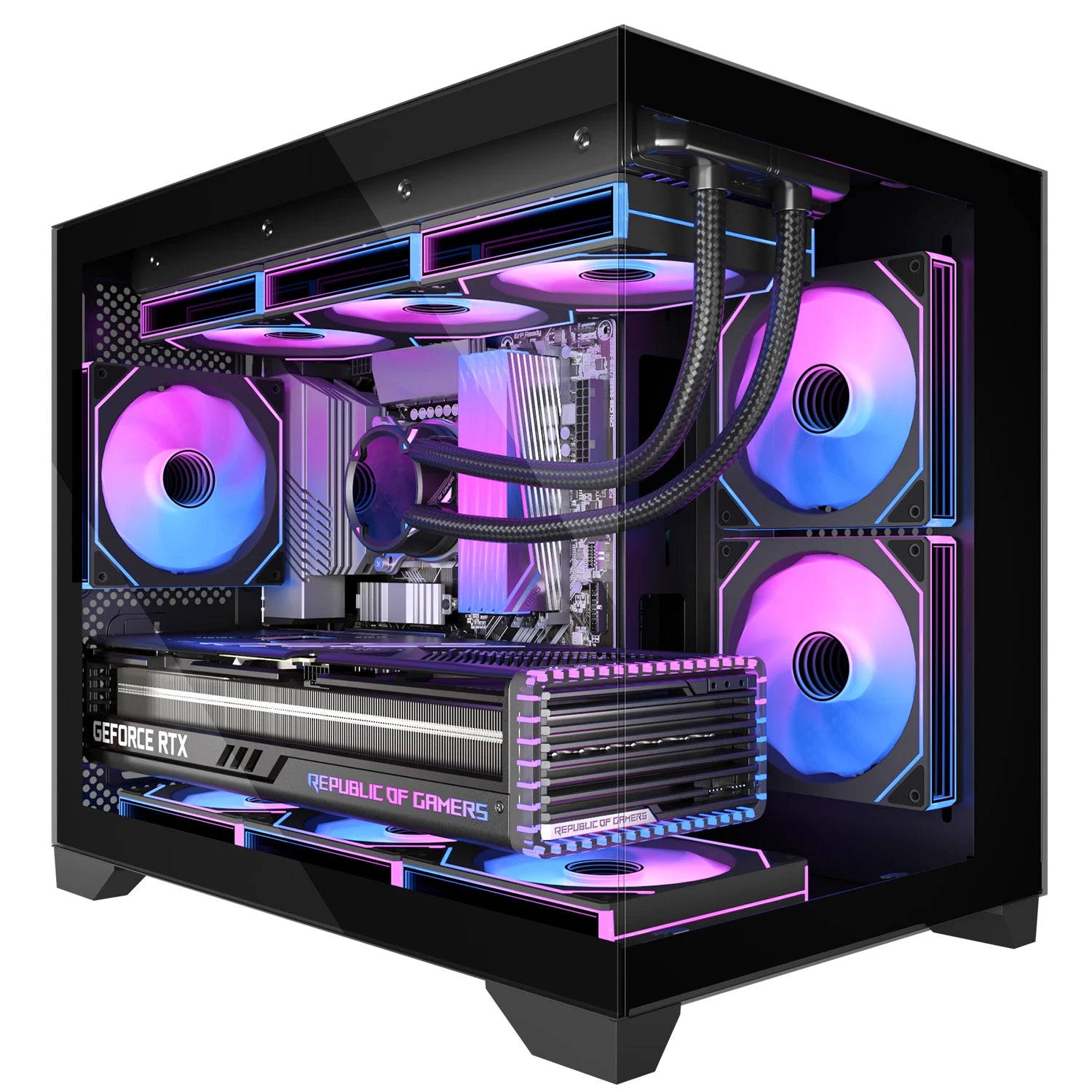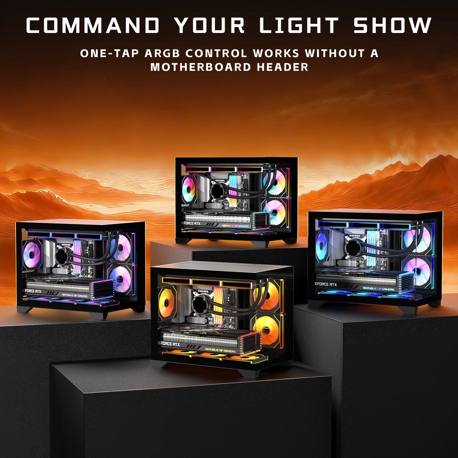 【Includes 3x120mm ARGB Reverse Fans】Elevate your build with this sleek matx case, which includes two pre-installed ARGB reverse fans. These fans not only create stunning seamless color transitions for a mesmerizing visual experience but also enhance airflow with their reverse blade design for optimal heat dissipation. Great for gamers and PC enthusiasts seeking both style and performance.