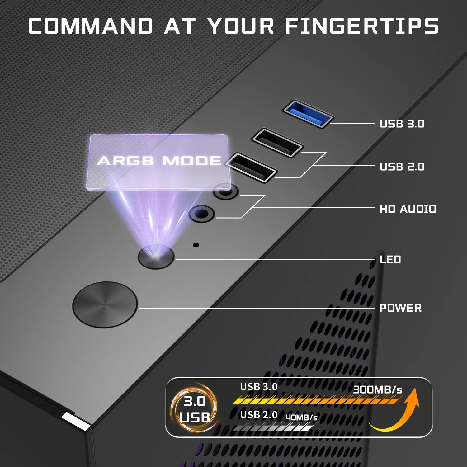 【I/O Panel】The pc gaming case is equipped with 1 x USB 3.0 port and 2 x USB 2.0 ports for high-speed connectivity, 2 x HD audio jacks for immersive sound, a power button, and a dedicated lighting control button to customize your rig's look. It's the versatile computer cases built to effortlessly handle both daily office tasks and immersive gaming sessions