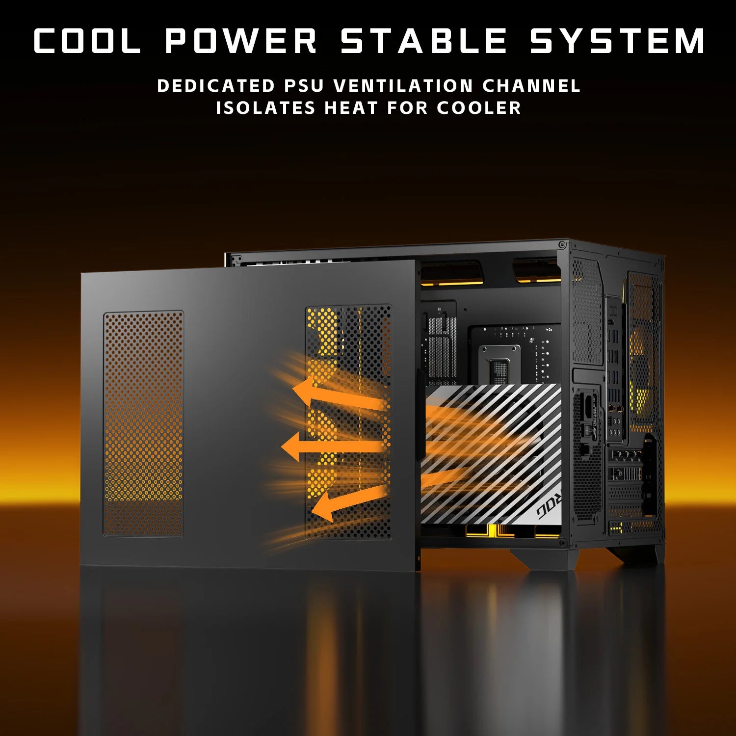 【PSU Cooling & Magnetic Filter】This gaming case features an independent ventilation channel for the power supply, ensuring efficient heat dissipation to prevent overheating. The top-mounted dust filter minimizes internal dust accumulation while maintaining optimal airflow, keeping your components cleaner and cooler for enhanced system performance and longevity.