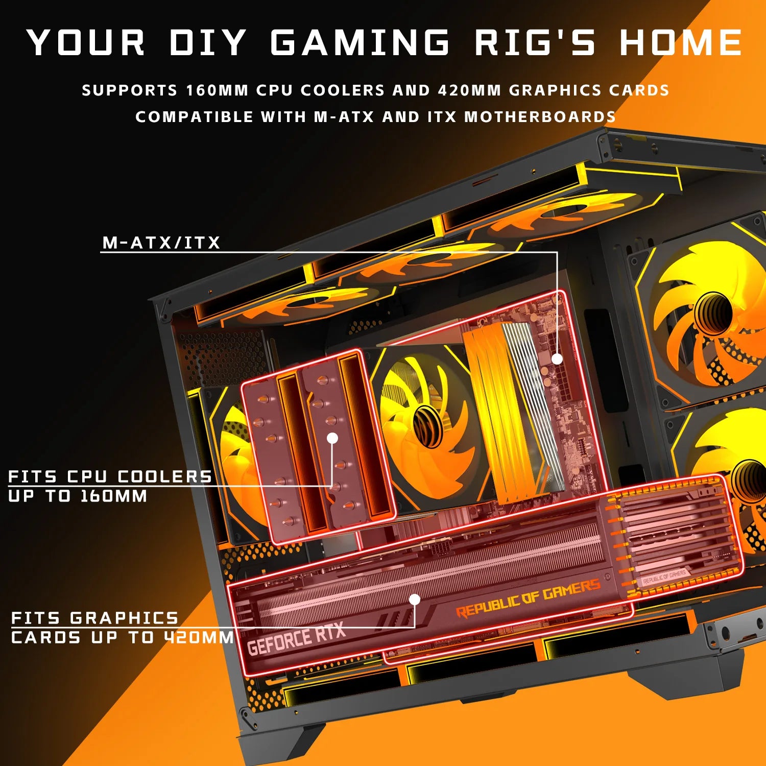 【PC Case Powerful Space Layout】Engineered for seamless builds, this high-performance micro atx case features a smartly partitioned interior that simplifies installation. It boasts extensive hardware support: compatible with M-ATX/ITX motherboards, accommodates massive 420mm (16.5") graphics cards and 160mm tall CPU coolers, supports top-mounted 360mm liquid cooling, and offers dedicated mounting for 1x 2.5" SSD and 1x 3.5" HDD.