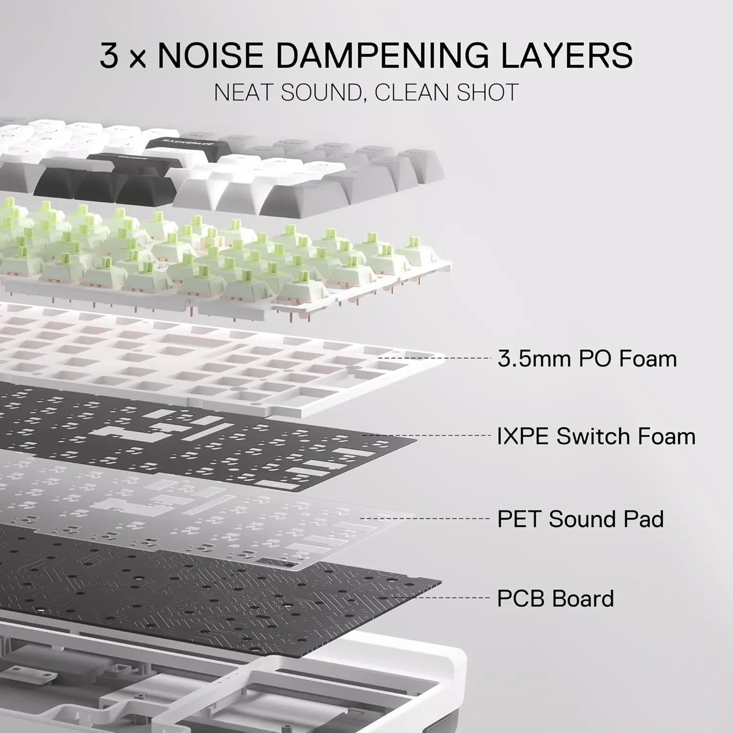 Noise Dampening x 3 - Equipped with 3.5mm PO foam, IXPE switch foam and PET sound pad. Creating dampened and ultra-clean typing acoustics, making each keystroke satisfying and audible.