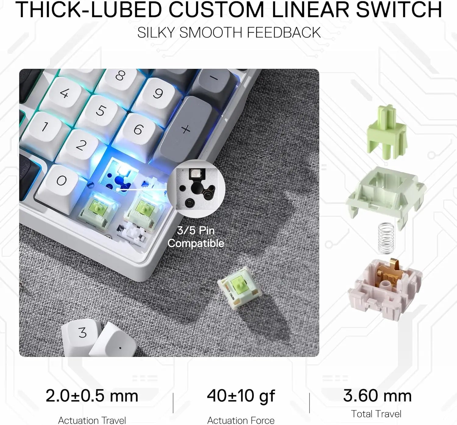Custom Mint Mambo Switch - With thick-lubed custom linear switches combo with a gasket form factor, K656 PRO features cushioned rich linear travel with silky creamy and cozy typing feedback. The brand new upgraded socket is nearly all switches(3/5 pins) compatible.