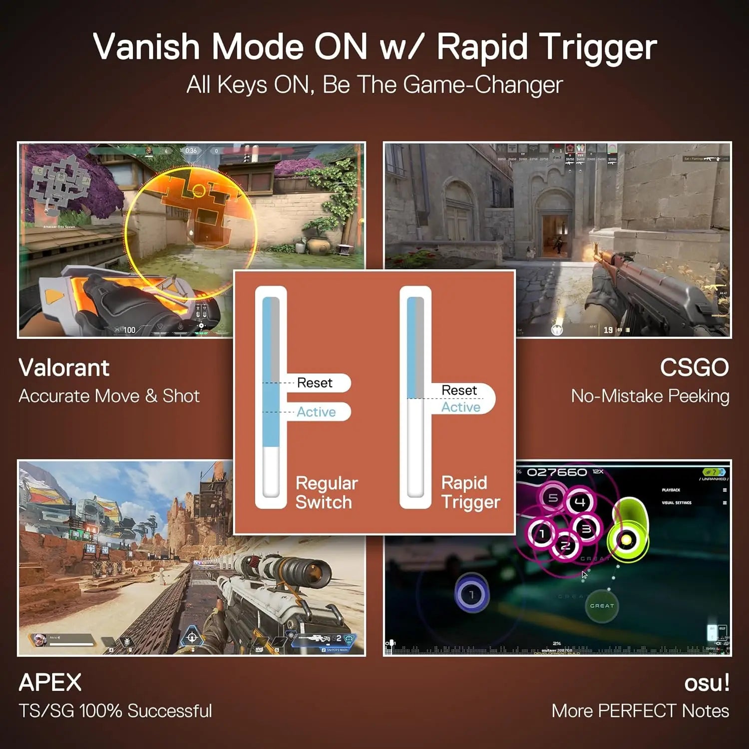 What Game Needs It - To be honest, all games that pursue timing, precision, and instant action need it. Valorant, helps with accurate moves and stopping to take the headshot. CSGO, makes the perfect peeking behind the wall and shoots advantagely. APEX, gets untrackable TS/SG movement 100% successful. and osu!, more PERFECT notes out.