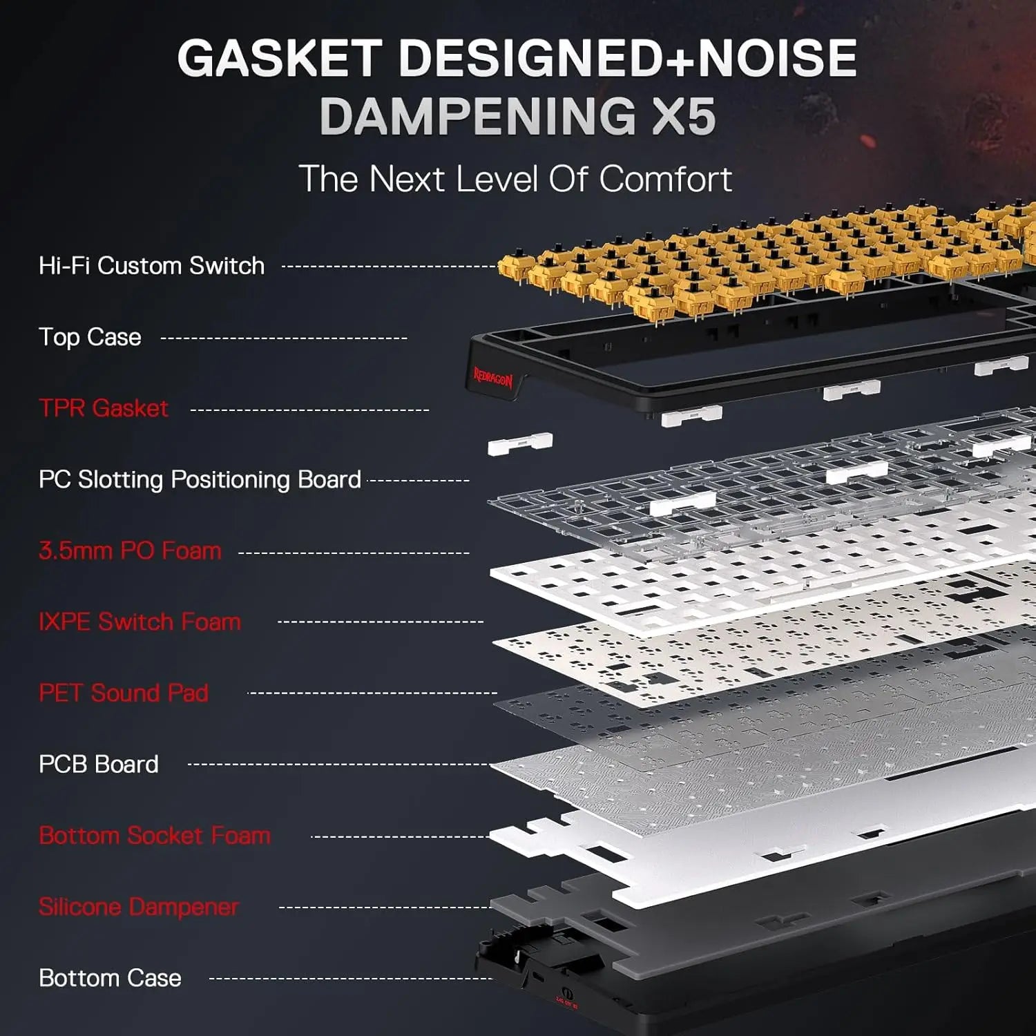 Noise Dampening x 5 - Equipped with 3.5mm PO foam, IXPE switch foam, PET sound pad, bottom socket foam, silicone bottom pad along with the silicone gasket. Significantly reduce the hollow noise, creating dampened and ultra-clean typing acoustics, making each keystroke satisfying and comfortable.