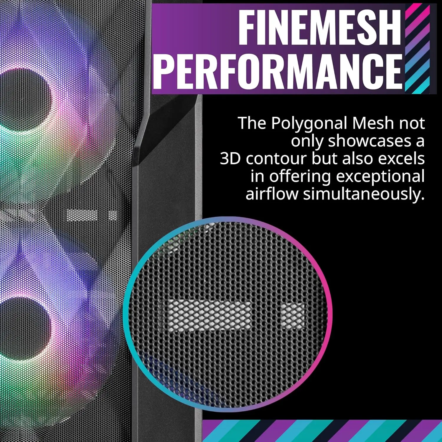 Enhance your PC build with this advanced ATX mid-tower case designed for optimal airflow and aesthetics. Key features include: 1. **Polygonal Mesh Design**: The front panel features a unique polygonal mesh pattern that maximizes air intake while adding a modern look to your setup. 2. **Crystalline Tempered Glass Side Panel**: Enjoy a clear view of your components with a durable tempered glass side panel that showcases your hardware in style. 3. **Removable Top Panel**: Easily access and clean the top area with a removable panel, ensuring maintenance is hassle-free and efficient. 4. **Customizable Cooling System**: Comes pre-installed with three 120mm PWM ARGB fans that offer adjustable speeds and vibrant lighting effects to match your preferences. 5. **Modern Connectivity**: Includes a USB Gen 2 Type C port for fast data transfer and compatibility with modern devices, enhancing convenience. 6. **Spacious Interior Layout**: Designed to accommodate standard ATX motherboards and various cooling solutions, providing ample space for cable management and component installation. 7. **Durable Construction**: Built with high-quality materials to ensure longevity and stability, making it a reliable choice for gaming or professional use. 8. **Easy Assembly Features**: User-friendly design includes tool-less drive bays and accessible ports to simplify the building process for all skill levels. This case combines functionality with visual appeal, making it an excellent addition to any PC enthusiast's collection.