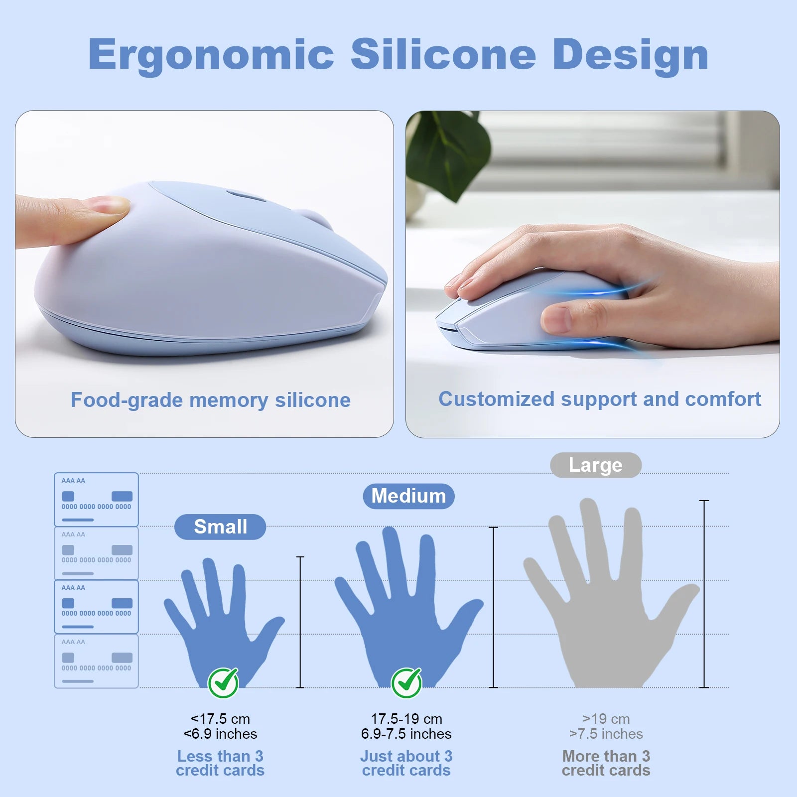 This computer mouse is ergonomically designed to fit the palm of your hand comfortably. It's crafted from a soft, food-grade memory silicone that is especially skin-friendly. This material offers personalized support that reduces pressure and fatigue, while its sculpted, compact form ensures a natural and enveloping grip—perfect for long hours of work or gaming.